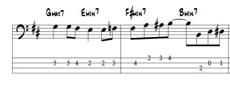 Every transition is different from line to line with one exception. The transition from Em7 to F#m7. This one part is the same every time. Notice he also walks up 7 of the 12 times, walks down 3 times, and bounces around only once. This is mostly an ascending line with intentional movement to make dramatic moves down so he can chromatically walk back up.